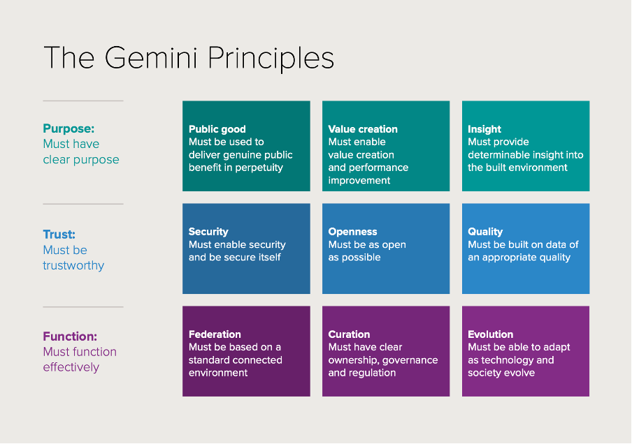 The Gemini Principles, developed by the Centre for Digital Built Britain (CDBB), serve as a guiding framework for the development and implementation of digital twin initiatives across various sectors and domains. Born from a collaborative effort involving a diverse array of experts spanning various sectors, including academia, industry, and government, the Gemini Principles embody a collective vision for the future of digital infrastructure in the UK. Their creation was a strategic initiative designed to ensure that the evolution of digital twins and the broader digital built environment aligns with public interests, fosters innovation, and upholds the highest ethical standards.