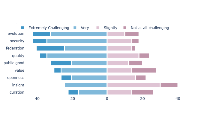 For all principles (except those rated as irrelevant), respondents were then asked to rate how challenging each principle was to implement. While “Moderately Challenging” was the most common response across all principles ==(not displayed below!)==, notable differences emerged in the more extreme ratings. For example, “federation” received the highest number of “extremely challenging” ratings, followed by “public good,”evolution” and “security.” In contrast, “insight” was the only principle never rated as “extremely challenging” and was generally seen as less challenging. Interestingly, the principles of “curation” and “openness” had symmetric extreme responses, with equal numbers finding them either not at all challenging or extremely challenging, possibly reflecting differences in sector or stages of digital twin adoption. This variability highlights the complexity of putting these principles into practice and warrants further exploration through in-depth interviews to understand the underlying reasons.