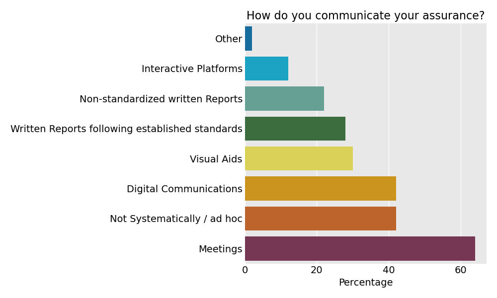 The majority of respondents (64%) communicate their assurance work verbally during meetings, with 42% not using any structured approach for this communication. Only 30% use visual aids in their reports, demonstrating a clear gap in effectively structuring and conveying assurance cases across the industry. Although some respondents do follow established standards or use visual aids, further exploration is needed to better understand current practices and identify how TEA could support and integrate with these existing approaches.