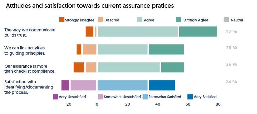 However, there was also a notable minority who disagreed with these statements, indicating variability in how assurance practices are perceived and implemented. This divergence may partly explain why 24% of respondents reported being unsatisfied with their overall assurance process.