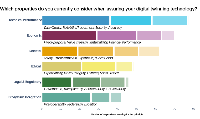 Some responses mentioned specific goals such as accuracy, utility, privacy, and reliability. Notably, safety and compliance were less prominent. The diversity in responses indicates that assurance, as a structured process or methodology (e.g. argument-based assurance), is not yet a mature or consistently shared concept across the digital twin community.
