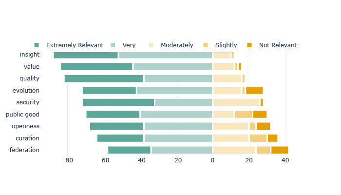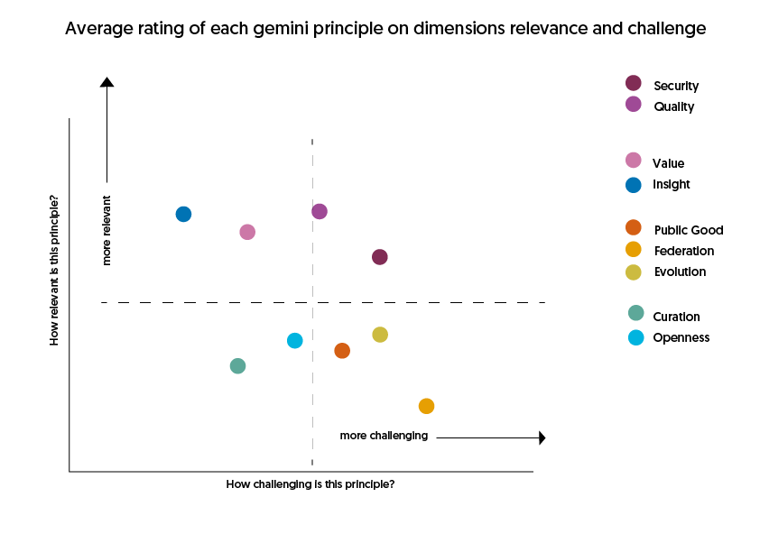 All of the Gemini principles were rated as either “Very” or “Extremely Relevant” by the majority of respondents, indicating a broad consensus on their overall importance. Among these, “Insight,” “Value,” and “Quality” were more often rated as “extremely relevant” compared to other principles, reflecting their particular significance within the community.